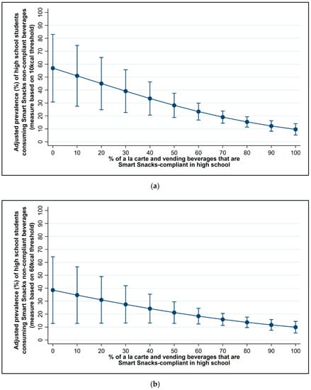 At the high school level, however, there was a significant, inverse relationship between the percentage of Smart Snacks-compliant beverages sold in schools and student consumption of non-compliant beverages while in school (see Figure 3 and Table A1 and Table A2). Specifically, the odds of students consuming Smart Snacks non-compliant beverages in school at the 10 and 60 kcal thresholds was significantly lower in schools with a higher percentage of Smart Snacks-compliant beverages (10 kcal threshold: OR: 0.97, 95% CI: 0.95, 0.99, p < 0.01; 60 kcal threshold: OR: 0.98, 95% CI: 0.96, 1.00, p < 0.05). Figure 3 illustrates the adjusted prevalence of high school student consumption of non-compliant beverages at the 10 kcal (panel a) and 60 kcal (panel b) thresholds as the percentage of compliant beverages available in schools increases from 0 to 100%. At the 10 kcal threshold (Figure 3, panel a), if none of the beverages in high school were Smart Snacks compliant, the adjusted prevalence of student consumption of non-compliant beverages at school is estimated to be nearly 60%; whereas, if 100% of the beverages sold in high school were compliant, the estimated adjusted prevalence of student consumption of non-compliant beverages at school is only 10% (brought from home or from a friend perhaps). Similarly, at the 60 kcal threshold (Figure 3, panel b), if none of the beverages sold in high school were Smart Snacks compliant, it is estimated that slightly less than 40% of students would consume non-compliant beverages at school; whereas, if 60% of the beverages sold in high school were compliant, slightly less than 20% of students would be estimated to consume non-compliant beverages at school.