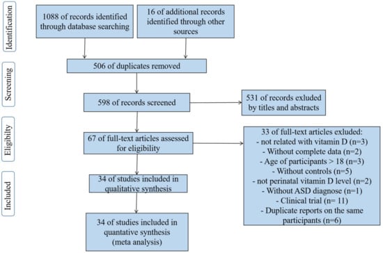 Figure 1 shows the process of identifying the eligible publications. A total of 1088 articles were retrieved through the databases: 221 records in PubMed, 439 records in EMBASE, 380 records in Web of Science, and 48 records in the Cochrane Library. In total, 16 articles were manually searched in the reference lists of relevant publications. After removing duplicates, 598 articles remained to be screened by title and abstract. Of these, 67 articles were left for full-text reading. Lastly, 34 eligible articles (a total of 20,580 participants) were included in the meta-analysis. Of these, 26 case–control studies [14,15,16,17,18,19,20,21,22,23,24,25,26,27,28,29,30,31,32,34,35,36,37,48,49,50] (1792 ASDs, 1969 controls) reported the blood vitamin D concentration of children and adolescents; three case–control studies [42,43,51], and two nested case–control studies [38,40](2687 ASDs, 3574 controls) examined the neonatal vitamin D concentration of participants; one case–control study [52] and one nested case–control study [38] (517 ASDs, 642 controls) assessed maternal vitamin D concentration of the ASD and control groups; two cohort studies [39,41] (5442 neonates, 3957 pregnant women) investigated the OR/RR for ASD incidence after being exposed to early-life vitamin D deficiency or insufficiency. The participants of two articles included not only neonates but also pregnant women, so there were 36 total studies from 34 articles.