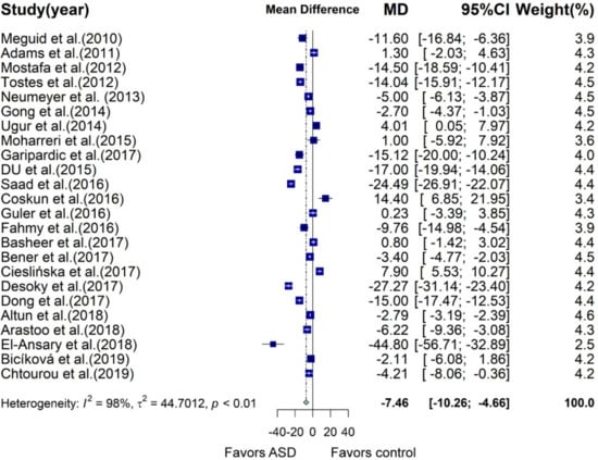 Forest plot of meta-analysis of 24 case control studies based on vitamin D concentration, showing that children and adolescents with autism spectrum disorder (ASD) have an average of 7.46 ng/mL lower vitamin D concentration than that of the controls, with 98% heterogeneity. MD, mean difference; CI, confidence interval.