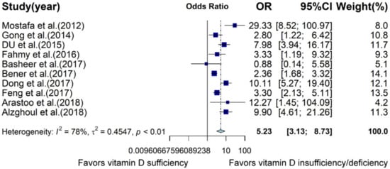 Forest plot of meta-analysis of 10 case–control studies based on odds ratio (OR), demonstrating that children with vitamin D insufficiency and deficiency are about 5.23 times more likely to develop ASD than vitamin D sufficient children are, with 78% heterogeneity. CI, confidence interval.