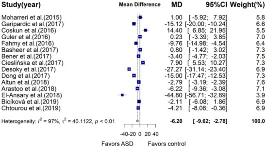 Forest plot of meta-analysis of 15 case–control studies based on vitamin D concentration, showing that children and adolescents with ASD have an average of 6.20 ng/mL lower vitamin D concentration than that of the control in studies conducted after May 2015, with 97% heterogeneity. MD, mean difference; CI, confidence interval.
