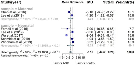 Meta-analysis of maternal and neonatal vitamin D concentration indicated that there was a trend of lower vitamin D concentration in subjects with ASD (MD: −3.15, 95% CI: −6.57; 0.26, p = 0.07, I2 = 99%; Figure 5, Table S8). Subgroup analysis showed that maternal and neonatal vitamin D concentration in the ASD group was 3.04 and 3.28 ng/mL lower than that of the control group (95% CI: −6.86; 0.77, p = 0.102, I2 = 93.3% and 95% CI: −8.47; 1.91, p = 0.228, I2 = 99.3%), respectively, but no statistical significance was observed.