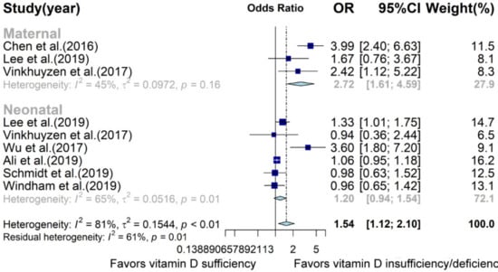 Nested case–control and cohort studies were also summarized to a pooled OR of 1.54 (95% CI: 1.12; 2.10; Figure 6, Table S9), suggesting that the lower level of maternal and neonatal vitamin D caused a 54% higher risk of later ASD onset. Subgroup analysis demonstrated that decreased maternal vitamin D concentration contributed to the development of ASD (OR: 2.72, 95% CI: 1.61; 4.59, p = 0.0002, I2 = 44.7%) but neonatal vitamin D concentration was not found to be significantly related to the risk of ASD (OR: 1.2, 95% CI: 0.94; 1.54, p = 0.15, I2 = 65.3%).