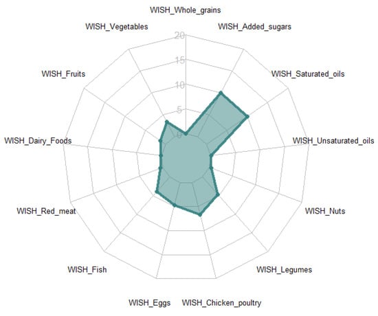 Low intakes and consumption of these food groups (saturated oils mean intake 0.2 g with 90.7% non-consumers and for added sugars a mean intake of 1.1 g with 81.1% non-consumers, Table 2) were observed, meaning that the intakes were far below the recommended dietary intakes by the EAT-Lancet commission and so, in actuality, healthier. Low scores were observed for whole grains (mean 0), fruits (mean 1.3), dairy foods (mean 0.1), nuts (mean 0.4) and unsaturated oils (mean 0.1) due to the high percentage of non-consumers, and an intake below the recommended intake for fruits, dairy foods, nuts and unsaturated oils. The recommendation for these food groups would be to increase their intake to obtain higher scores. Scores for red meat (mean 0.5) and fish (mean 3.9) were also low as intakes often exceeded the EAT-Lancet recommendations. To increase WISH scores for these food groups, intakes should decrease. In this sample, 39.6% and 55.1% did not consume eggs and chicken and poultry respectively. This part of the population could increase their intake to a maximum of 15 g for eggs and 30 g for chicken and poultry while still scoring high on the WISH. Though the part of the population that does consume these food groups consumes above the recommended intake 25.1 g for eggs and 37.7 g for chicken and poultry, for that group it is recommended to lower their intake.