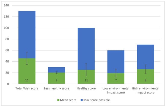Higher mean scores on the total and sub-scores indicate the population consumes a healthier and more sustainable diet. This also holds for the less healthy and low environmental impact sub-scores, as the component scores are inversely scored a higher mean score on the less healthy sub score indicates a consumption within the recommended intake range of the moderation components. A higher mean score on the low environmental impact sub score indicates the components with a medium or high environmental impact are consumed within the recommended range of intake and are thus within the planetary boundaries. The total mean WISH score in this Vietnamese population was 45.7 (SD 11) out of 130 (Figure 2). This population scored relatively high on the less healthy sub score (20.4 out of 30), due to the high mean component scores of 2 (saturated oils and added sugars) out of 3 components included in this sub-score. However, a low score was observed for the healthy sub-score (25.3 out of 100) due to the low scores on whole grains, vegetables, fruits, dairy foods, and nuts (because of mean consumption of the population below the recommended intake) and low scores on fish and unsaturated oils because of higher consumption than recommended. The high environmental impact sub-score scored 26.3 (out of 70) due to the low component scores of dairy foods, nuts (consumed less than recommended) and red meat and fish (because of higher consumption than recommended).