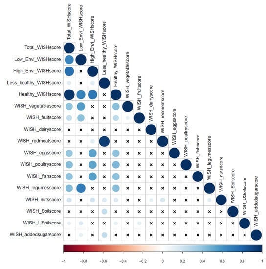 Heatmap of Spearman correlations amongst components scores, total WISH and sub scores (insignificant p values (significance level p ≤ 0.05) are crossed), the WISH score for whole grains is not shown as the majority of the population scores 0, and thus no correlation could be made. Larger circles mean a stronger correlation (for positive and negative correlations). WISH_USoilscore: unsaturated oil WISH score; WISH_Soilscore: saturated oil WISH score.