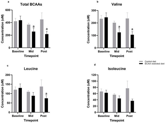 (a–d). Comparison of Total and individual Branched-chain amino acid (BCAA) levels between control and BCAA-restricted diets. Values are means (standard error of mean). a significantly different from baseline, p < 0.05. Mid: Day 3, Post: Day 7.