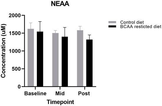 Although the primary aim of this study was to lower circulating BCAA concentrations, we also aimed to design a diet that met protein requirements and was iso-nitrogenous between the restricted diet and control, due to the crucial role of BCAA in regulating muscle metabolism. This included the non-essential amino acids (NEAA) and essential amino acids minus the three BCAAs (EAA—BCAAs). We found no significant differences between all the NEAA and EAA—BCAA during both the BCAA-restricted and control diets (p > 0.05) (Figure 2 and Figure 3).