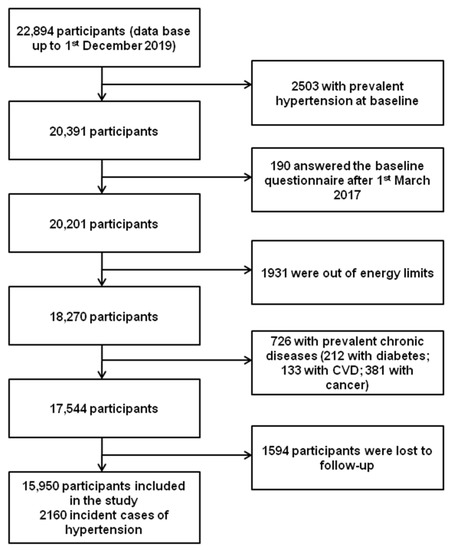 We performed the analyses taking in consideration the last available database as of December 1st, 2019, corresponding to 22,894 participants. We excluded from the analyses those participants with hypertension at baseline (n = 2503), those who answered the baseline questionnaire after 1 March 2017 (n = 190), those with total energy intake out of usual predefined limits [31] (n = 1931), those with other chronic diseases at baseline (with diabetes n = 212; with CVD n = 133; with cancer n = 381), and those who were lost to follow-up (n = 1594). The final effective sample for longitudinal analyses was of 15,950 participants with an overall retention rate of 90.91 (90.91% of participants returned ≥ 1 follow-up questionnaire). During follow-up, 2160 participants reported having received a new diagnosis of hypertension (Figure 1).