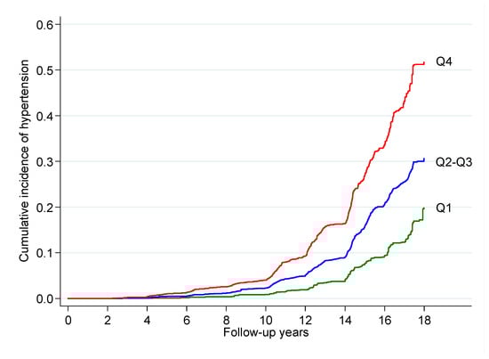 Figure 2 shows the cumulative incidence of hypertension during follow-up for the lower quartile (Q1), the second and third quartiles combined (Q2–Q3), and the fourth quartile (Q4) of body fat.