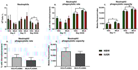 There were no interactions between diet and birthweight for the neutrophil counts on postnatal days 2, 11, or 23/24 (Figure 1A), likewise no interactions were apparent for neutrophil phagocytic rate or capacity (Figure 1B,C). There was however a main effect of diet, with lower neutrophil counts on day 23/24 in milk-fat-fed animals along with a higher neutrophil phagocytic rate (both p < 0.05, Figure 1A,B), while neutrophil phagocytic capacity was higher on day 11 and tended to be higher on day 23/24 (p < 0.05 and p = 0.06, Figure 1C). This effect of milk-fat-based formula on neutrophil phagocytic function was not apparent when co-incubating blood cells of 19-day-old farm reared pigs with plasma of VEG- or MILK-fed animals (both p > 0.1, Figure 1D,E).