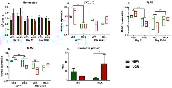 Development of monocyte counts and gene expression of innate immune markers in animals fed either vegetable (VEG, n = 6–18) or milk fat (MILK, n = 7–18) further stratified into normal birthweight (NBW, n = 7–18) or intrauterine growth restricted (IUGR, n = 6–18) animals. (A) Monocyte counts; (B–D) Expression of CXCL10, TLR2, and TLR4 in whole blood stimulated with Staphylococcus epidermidis, shown as relative gene expression; (E) Level of CRP in plasma on day 23/24. (A,E) are presented as means with corresponding standard error, (B–D) are presented as range plots with corresponding medians. **: p < 0.01, *: p < 0.05, (*): p < 0.1.