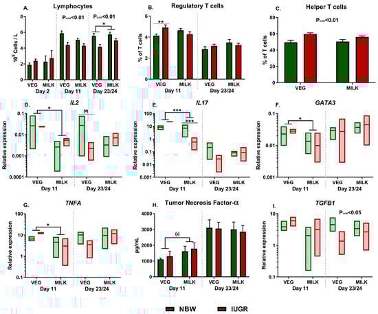 Development of lymphocyte and T cell counts and gene expression of adaptive immune markers in animals fed either vegetable (VEG, n = 6–18) or milk fat (MILK, n = 7–18) further stratified into normal birthweight (NBW, n = 7–18) or intrauterine growth restricted (IUGR, n = 6–18) animals. (A) Lymphocyte counts; (B,C) Fraction of regulatory and helper T cells; (D–G,I) Expression of IL2, IL17, GATA3, TNFA, and TGFB1 in whole blood stimulated with Staphylococcus epidermidis, shown as relative gene expression; (H) Levels of tumor necrosis factor α in samples following stimulation with SE. (A–C,H) are presented as means with corresponding standard error. (D–G,I) are presented as range plots with corresponding medians. *: Effect of diet, ***: p < 0.001, **: p < 0.01, *: p < 0.05, (*): p < 0.1. Main effects of birthweight across diet groups are shown in the figures as PIUGR.