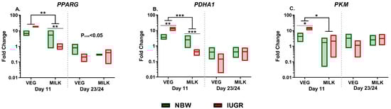Expression of genes related to energy metabolism was investigated in whole blood samples stimulated with SE. On day 11, there were interactions between diet and birthweight on the expression of PPARG and PDHA1 (both p < 0.05) with post hoc tests in both cases indicating lower expression in MILK-IUGR than MILK-NBW (p < 0.01, p < 0.001, Figure 4A,B). Likewise, expression of PPARG, PDHA1, and PKM was lower in MILK than VEG pigs (all p < 0.05 FC, Figure 4A–C). By day 23/24, compared to NBW, the IUGR animals showed a lower expression of PPARG (p < 0.05, Figure 4C).