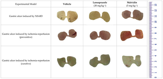 Macroscopic images of mice stomach treated with vehicle, lansoprazole (30 mg/kg) and malvidin (5 mg/kg) submitted to gastric ulcer induced by indomethacin (NSAID) and ischemia-reperfusion (both preventive and curative models).