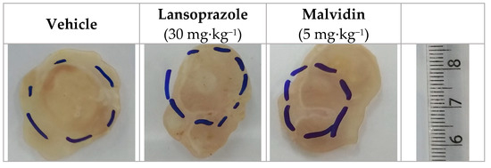 Macroscopic images of mice stomach submitted to gastric ulcer induced by acetic acid and treated for 14 days with vehicle, lansoprazole (30 mg/kg) and malvidin (5/mg/kg). The dashed line represents the ulcer size and localization.