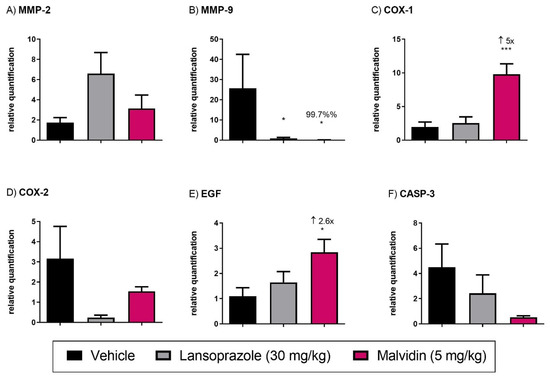 (A) MMP-2, matrix metalloproteinase (B) MMP-9, matrix metalloproteinase (C) COX-1 cyclooxygenase 1 (D) COX-2, cyclooxygenase 2 (E) EGF, epidermal growth factor and (F) CASP-3, caspase-3. The results show the relative gene expression of vehicle, lansoprazole (30 mg/kg) and malvidin (5 mg/kg) treated animals submitted to duodenal ulcer induced by polypharmacy. Data are presented as mean ± S.E.M. ANOVA followed by Dunnett′s test * p < 0.05 *** p < 0.001 represents difference in relation to control group treated with vehicle.