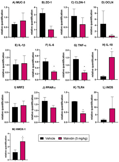 (A) MUC-3, mucin 3 (B) ZO-1, zonula occludens 1 (C) CLDN-1,claudin 1 (D) OCLN, occludin (E) IL-1β, interleukin 1 beta (F) IL-6, interleukin 6 (G) TNF-α, tumor necrosis factor alfa (H) IL-10, interleukin 10 (I) NRF2, nuclear factor erythroid 2-related factor 2 (J) PPAR-γ, peroxisome proliferator-activated receptor gamma (K) TLR4, toll like receptor 4 (L) iNOS, inducible nitric oxide synthase (M) HMOX-1, heme oxygenase 1. The results show the relative gene expression of vehicle or malvidin (5 mg/kg) treated animals submitted to duodenal ulcer induced by polypharmacy. Data are presented as mean ± S.E.M. Parametric Student T Test * p < 0.05 represents difference in relation to control group treated with vehicle.