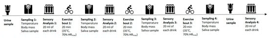 Participants came into the laboratory for a single main trial after refraining from caffeine, alcohol and physical activity for at least 24 h prior. Figure 1 shows a schematic representation of the overall study design. Participants wore a sweat suit during exercise and (in a private room) removed the suit, towel dried themselves, before undertaking body mass, saliva, and sensory analyses. Sensory evaluation was conducted in a single trial, of an ORS, a traditional sports drink, and a flavored water placebo at rest and after each of 3 × 20-min bouts of exercise in a randomized, double-blind design. Urine samples were collected before and after the 60 min of exercise; and saliva samples, aural temperature, and semi-nude body mass were assessed before and after each 20-min exercise bout. After the final exercise bout, a urine sample was collected. Participants were then able to take a shower and rehydrate with refreshments provided.