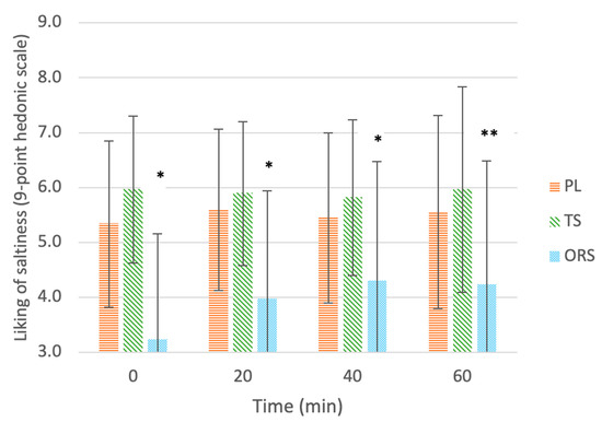 Liking of saltiness of drinks: ORS—oral rehydration solution, PL—placebo, TS—traditional sports drink, on a 9-point hedonic scale throughout 60 min of exercise. Values are mean ± SD. * Significant effect of the treatment vs. the placebo (p < 0.05). ** Significant delta change in ratings compared to 0 min before exercise (p < 0.05).