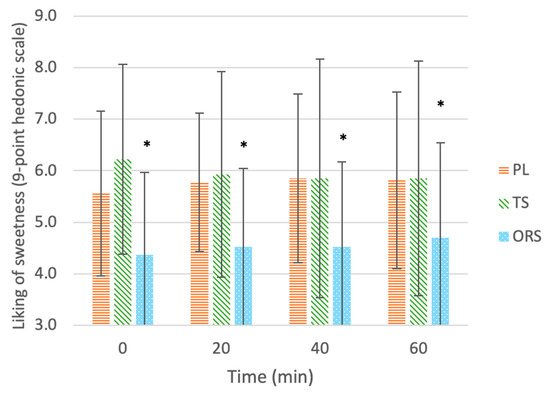 Liking of sweetness of drinks: ORS—oral rehydration solution, PL—placebo, TS—traditional sports drink, on a 9-point hedonic scale throughout 60 min of exercise. Values are mean ± SD. * Significant effect of the treatment vs. the placebo (p < 0.05).