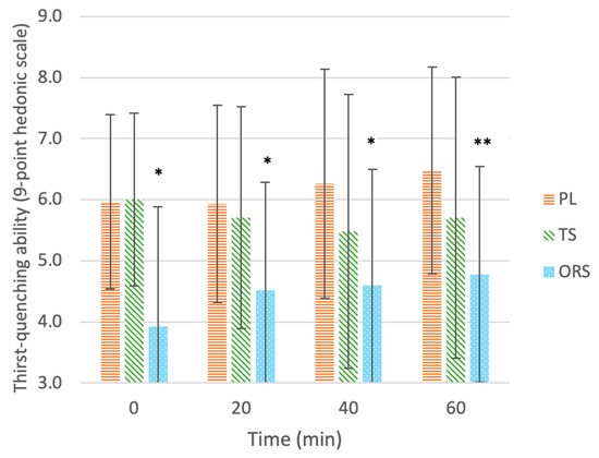 Liking of thirst-quenching ability of drinks: ORS—oral rehydration solution, PL—placebo, TS—traditional sports drink, on a 9-point hedonic scale throughout 60 min of exercise. Values are mean ± SD. * Significant effect of the treatment vs. the placebo (p < 0.05). ** Significant delta change in ratings compared to 0 min before exercise (p < 0.05).