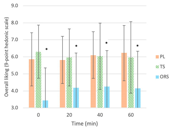 Overall liking of drinks: ORS—oral rehydration solution, PL—placebo, TS—traditional sports drink, on a 9-point hedonic scale throughout 60 min of exercise. Values are mean ± SD. * Significant effect of the treatment vs. the placebo (p < 0.05).