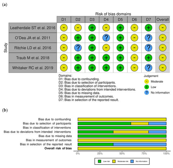 The risk of bias assessment for the included longitudinal studies is presented in Figure 2a,b. All studies [18,19,20,21,22] were judged to be at moderate risk both for bias due to confounding and for bias in measurement of the outcome, mainly due to some expected, but not serious, residual confounding and to self-reported measures, respectively. Two studies (40%) [18,20] were judged to be at moderate risk for bias due to deviation from intended intervention, particularly in terms of implementation or adherence. All studies [18,19,20,21,22] were considered at low risk for bias in classification of intervention and bias due to missing data. Thus, the overall risk of bias judgment for all the selected longitudinal studies was “Moderate risk”.