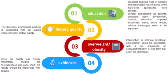 With these limitations acknowledged, our systematic review on intervention studies suggests that breakfast skipping is associated with a high prevalence of OW/OB and a low nutrition quality—one of the potential players in weight gain and metabolic derangement (Figure 4). Further high quality and long-term randomized controlled and longitudinal trials are needed to evaluate whether children and adolescents who eat breakfast are better protected against OW/OB and cardiometabolic risk than those who skip it, and whether strategies to introduce breakfast eating in young people is efficacious in the prevention of circadian rhythm misalignment. Our findings provide insights into the need for a multi-level approach to impact on lifestyle habits.