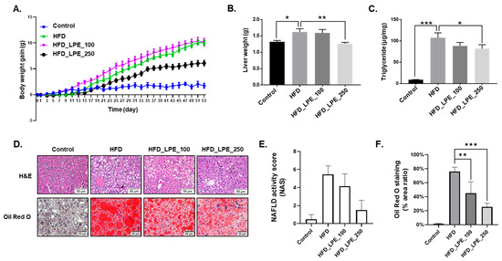 To investigate whether LPE has an effect on weight loss in HFD-induced obese mice, the mice were orally administered 100 or 250 mg/kg of LPE daily for 8 weeks. As shown in Figure 1A, the HFD-fed mice (HFD group) showed significantly increased body weight gain compared to mice fed a normal diet (control group). The body weight gain of the 100 mg/kg LPE-administered mice (HFD_LPE_100 group) was not significantly different from that of the HFD group. However, the body weight gain of the mice treated with 250 mg/kg of LPE (HFD_LPE_250 group) was significantly reduced compared to the HFD group. We checked the weight of the liver after 8 weeks of LPE administration. The liver weight was higher in the HFD group than in the control group, but there were no differences in liver weight between the HFD group and the HFD_LPE_100 group. The liver weight was remarkably decreased in the HFD_LPE_250 group compared to that in the HFD group (Figure 1B).