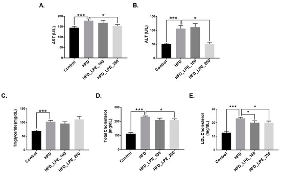 Figure 2. Effect of LPE on serum biochemical parameters in HFD-fed mice. Eight weeks after beginning the HFD, the C57BL/6 mice were orally administered LPE (100 or 250 mg/kg body weight) or PBS daily. Blood samples were collected after 8 weeks, and their biochemical parameters were measured. (A) Aspartate aminotransferase (AST), (B) alanine aminotransferase (ALT), (C) total triglyceride, (D) total cholesterol, and (E) low-density lipoprotein (LDL) cholesterol. Data are shown as mean ± SEM, n = 7–11/group, * p < 0.05, *** p < 0.001. One-way ANOVA was performed along with Fisher’s protected least significant difference test.