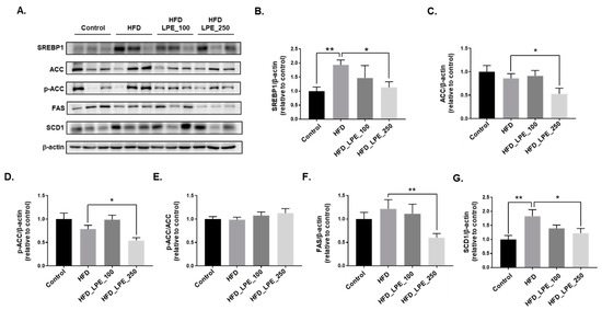 Figure 3. LPE treatment decreased the expression of proteins involved in lipogenesis in HFD-fed mice. SREBP1, ACC, p-ACC, FAS, and SCD1 protein expression levels were analyzed using Western blotting. Beta-actin was used as the loading control for equal amounts of protein. (A) Representative immunoblots of SREBP1, ACC, p-ACC, FAS, and SCD1, together with β-actin, and the relative intensity levels of (B) SREBP1, (C) ACC, (D) p-ACC, (E) p-ACC/ACC, (F) FAS, and (G) SCD1, were normalized to beta-actin. Data are shown as mean ± SEM, n = 6–8/group for SCD1, n = 6–11/group for other genes. * p < 0.05 or ** p < 0.01. One-way ANOVA was performed along with Fisher’s protected least significant difference test.