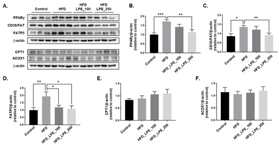 Figure 4. LPE treatment decreased the expression of proteins involved in fatty acid uptake in HFD-fed mice. PPARγ, CD36/FAT, FATP5, CPT1, and ACOX1 protein expressions were analyzed by Western blotting. Beta-actin was used as the loading control for equal amounts of protein. (A) Representative immunoblots of PPARγ, CD36/FAT, FATP5, CPT1, and ACOX1, together with β-actin, and the relative intensity levels of (B) PPARγ, (C) CD36/FAT, (D) FATP5, (E) CPT1, and (F) ACOX1, were normalized to beta-actin. Data are shown as mean ± SEM, n = 6–11/group. * p < 0.05, ** p < 0.01, or *** p < 0.001. One-way ANOVA was performed along with Fisher’s protected least significant difference test.