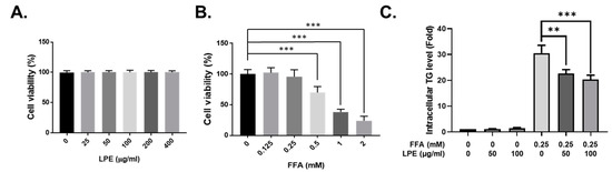 Figure 5. LPE treatment decreased TG accumulation in FFA-treated HepG2 cells. (A) Effects of LPE on cell viability in HepG2 cells. HepG2 cells were incubated with various concentrations of LPE for 24 h and the cell viability was measured using a CCK-8 assay kit. (B) Effects of FFA on HepG2 cell viability. HepG2 cells were incubated with various concentrations of FFA for 24 h and the cell viability was measured using a CCK-8 assay kit. (C) Effect of LPE on FFA-induced TG accumulation in HepG2 cells. HepG2 cells were incubated with or without 0.25 mM of FFA and 50 or 100 µg/mL of LPE for 24 h. The TG was measured using a TG assay kit. Data are shown as mean ± SEM, n = 3, ** p < 0.01 or *** p < 0.001. One-way ANOVA was performed along with Fisher’s protected least significant difference test.