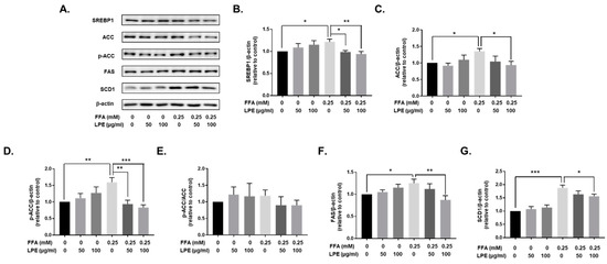 HepG2 cells were seeded at 2.5 × 105 cells/well in 6-well plates and treated with 50 or 100 μg/mL of LPE or 0.25 mM of FFA in growth medium for 12 h. Total protein from the liver tissues or HepG2 cells was extracted in a mixture of mammalian protein extract buffer (GE Healthcare Life Sciences, Marlborough, MA, USA), protease inhibitor, and phosphatase inhibitor (Sigma-Aldrich, St Louis, MO, USA). Twenty micrograms of the lysates were separated using sodium dodecyl sulfate-polyacrylamide gel electrophoresis. Then, nitrocellulose membranes (GE Healthcare Life Sciences, Marlborough, MA, USA) were used for the transfer and 5% BSA, and Fraction V (MP Biomedicals, Irvine, CA, USA) was used for 1 h to block the transferred membrane, which was then incubated with primary antibodies: FAS and SCD1 (Santa Cruz Biotechnology, Paso Robles, CA, USA), SREBP1, FATP5, and CD36 (Abcam, MA, USA), and ACC, p-ACC, and β-actin (Cell Signaling, Danvers, MA, USA). The membrane was then incubated with secondary antibodies for 1 h at room temperature. The protein bands were visualized using enhanced chemiluminescence (ECL) detection kits and detected using the ChemidocTM XRS+ system. ImageJ software was used to quantify the optical density of the protein bands.