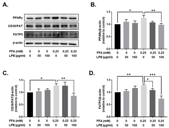 Figure 7. LPE treatment decreased the expression of proteins involved in fatty acid uptake in FFA-treated HepG2 cells. PPARγ, CD36/FAT, and FATP5 protein expressions were analyzed by Western blotting. Beta-actin was used as the loading control for equal amounts of protein. (A) Representative immunoblots of PPARγ, CD36/FAT, and FATP5, together with the relative intensity levels of (B) PPARγ, (C) CD36/FAT, and (D) FATP5, were normalized to beta-actin. Data are shown as mean ± SEM, n = 5/group, * p < 0.05, ** p < 0.01, *** p < 0.001. One-way ANOVA was performed along with Fisher’s protected least significant difference test.