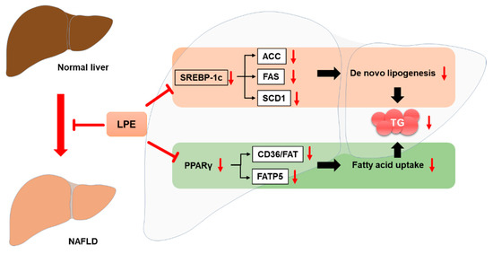 Our data suggest that LPE may attenuate HFD-induced NAFLD by decreasing lipid accumulation through inhibition of lipogenesis and fatty acid uptake, but not by an increase in fatty acid oxidation. The LPE treatment decreased the expressions of proteins involved in lipogenesis and fatty acid uptake via downregulation of SREBP1c and PPARγ, respectively (Figure 8).
