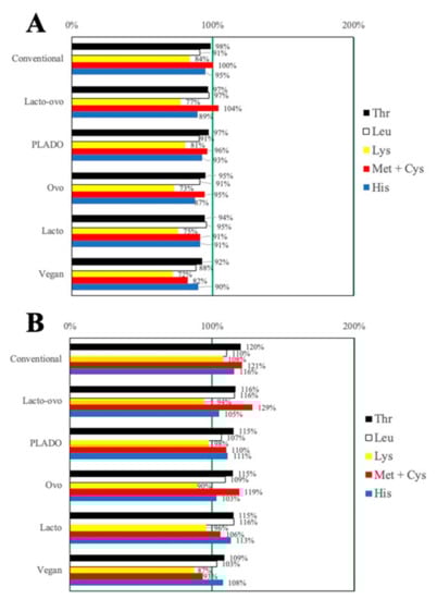 At the dietary protein prescription of 0.5 g/kg/day, no diet met the RDA for threonine, leucine, lysine, and histidine. Furthermore, the PLADO, lacto-vegetarian, ovo-vegetarian, and vegan diets did not meet the RDA for methionine + cysteine. The percent adequacy for these EAAs according to their RDA is presented in Figure 1A.