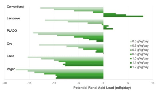 Figure 2 shows the PRAL of all types of LPDs and MHPDs. All PLADO, lacto-vegetarian, and vegan diets had negative PRAL, though at a decreasing trend when the protein prescription increased. The ovo-vegetarian diets had negative PRAL values at protein prescriptions from 0.5 to 1.1 g/kg body weight/day, and the PRAL value became positive at protein prescription of 1.2 g/kg body weight/day. The conventional and lacto-ovo-vegetarian diets had negative PRAL values at protein prescription below 0.8 g/kg body weight/day, and the PRAL values became positive at 1.0 g protein/kg body weight/day and above.