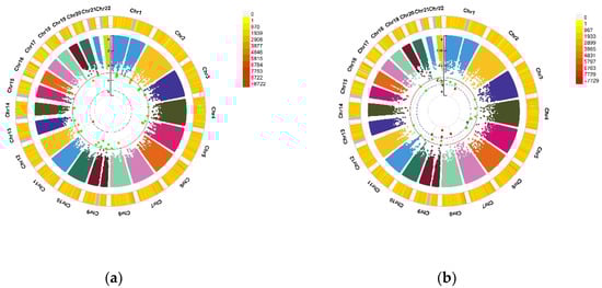 Genomic regions interacting with blood VD for the PHQ score and the GAD score. (a) Depression (PHQ score), A SNP allele was found to significantly interact with blood VD in depression (PHQ score); (b) Anxiety (GAD score), seven independent SNP alleles were found to significantly interact with blood VD in anxiety disorder (GAD score). From the center, the first circos depicts the −log10 p-values of each variant due to double exposure, i.e., the effect of both SNP allele and blood VD. The second circos shows chromosome density. Red dots represent the p < 5 × 10−8 and green dots represent p < 1 × 10−7. The figure was generated using the “CMplot” R script (https://github.com/YinLiLin/R-CMplot) (accessed on 15 February 2021).