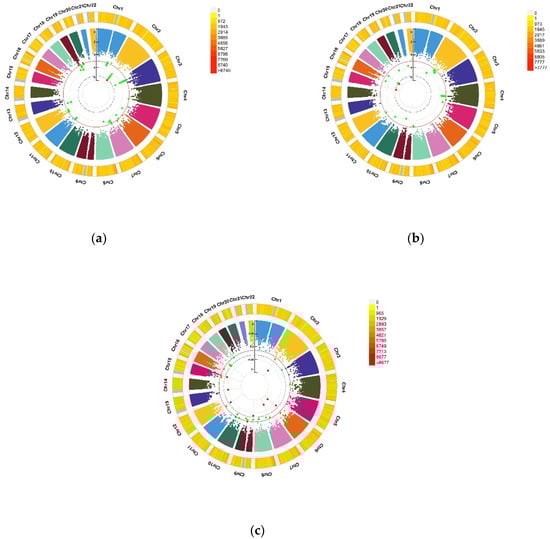 Genomic regions interacting with VD PRS after COJO adjustment for depression status, anxiety status, and GAD score. (a) Depression status, a SNP allele was found to significantly interact with blood VD in depression status; (b) Anxiety status, 2 independent SNP alleles were found to significantly interact with blood VD in anxiety status; (c) Anxiety (GAD score), 8 independent SNP alleles interacted significantly with blood VD in anxiety disorders (GAD score). From the center, the first circos depicts the −log10 p-values of each variant due to double exposure, i.e., the effect of both SNP allele and VD PRS after COJO adjustment. The second circos shows chromosome density. Red dots represent the p < 5 × 10−8 and green dots represent p < 1 × 10−7. The figure was generated using the “CMplot” R script (https://github.com/YinLiLin/R-CMplot) (accessed on 15 February 2021).