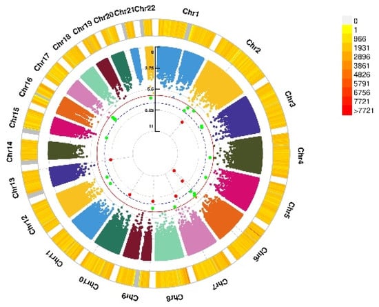 Genomic regions interacting with VD PRS before COJO adjustment for GAD score. This graph shows 7 independent SNP alleles interacting significantly with blood VD in anxiety disorders (GAD score). From the center, the first circos depicts the −log10 p-values of each variant due to double exposure, i.e., the effect of both SNP allele and VD PRS before COJO adjustment. The second circos shows chromosome density. Red dots represent the p < 5 × 10−8 and green dots represent p < 1 × 10−7. The figure was generated using the “CMplot” R script (https://github.com/YinLiLin/R-CMplot) (accessed on 15 February 2021).