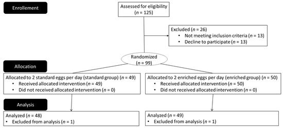 No adverse events related to the study were observed or reported by participants. During the four-month intervention, the participants consumed an average of 13.5 eggs (mean ± 0.7(SD)) per week instead of 14 (13.50 ± 0.65 in control group, 13.55 ± 0.72 in enriched group), corresponding to an adherence rate of 93.6%.