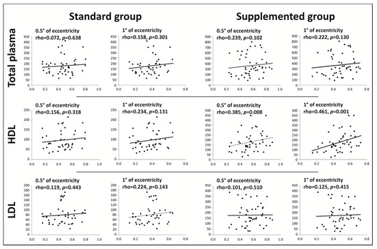 Correlation between total plasma, HDL, and LDL concentrations of lutein and MPOD at 0.5° and 1° eccentricities. Lutein concentrations are expressed as ng/mL of plasma in total plasma and as ng/mg of proteins in HDL and LDL fractions (y axis). MPOD is expressed as density units (x axis). n = 48 in standard group, n = 49 in enriched group. Correlations were assessed by using Spearman’s test.