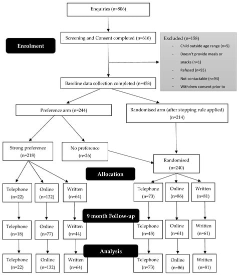 - Hammersley, M.L.; Wyse, R.J.; Jones, R.A.; Wolfenden, L.; Yoong, S.; Stacey, F.; Eckermann, S.; Okely, A.D.; Innes-Hughes, C.; Li, V.; et al. Translation of two healthy eating and active living support programs for parents of 2-6 year old children: A parallel partially randomised preference trial protocol (the ‘time for healthy habits’ trial). BMC Public Health 2020, 20, 636. [Google Scholar] [CrossRef]