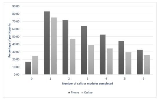 | Control (n = 81) | Online (n = 86) | Telephone (n = 73) | Control (n = 64) | Online (n = 132) | Telephone (n = 22) | (n = 458) | |
