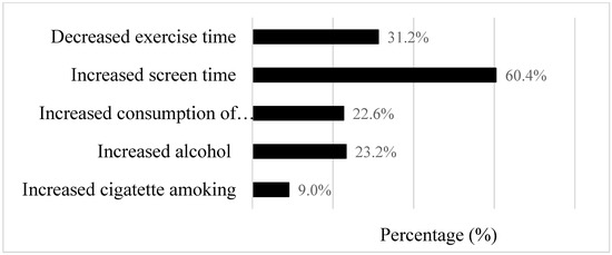 Figure 2 shows the percentage of participants who had undesired changes of five lifestyle behaviors (i.e., decreased exercise, increased screen time, increased numbers of fast-food meals, increased cigarettes smoking, or increased alcohol drinking during the pandemic as compared with before the pandemic). Overall, 31.2% of the participants experienced decreased exercise time, 60.4% increased screen time, 22.6% increased consumption of fast-food meals, 23.3% increased alcohol drinking, and 9.0% increased cigarette smoking during the pandemic compared to before the pandemic.