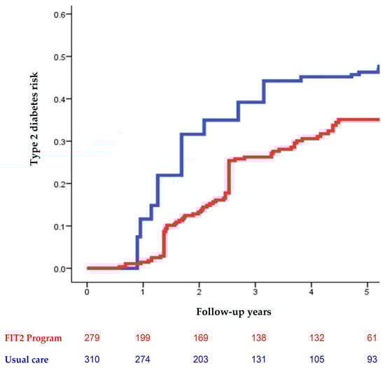 Kaplan–Meier failure plots show that participants joining the FIT2 program had a lower risk of incident type 2 diabetes (red line) compared with participants receiving usual care (blue line). The log-rank test was significant with p = 0.008.