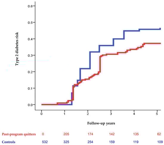 Modified Kaplan–Meier failure plots show that the post-program quitters at six months had a lower risk of incident type 2 diabetes (red line) compared with the controls (blue line). The log-rank test was significant with p = 0.016.