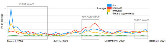 In our research, we found that the highest percentage of people during all three waves used food supplements containing only vitamin D, while searches on Google Trends indicate that, during the first wave, information about zinc was more popular—the importance of vitamin D increased during the second wave (Figure 1).
